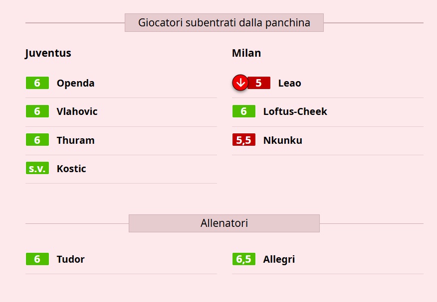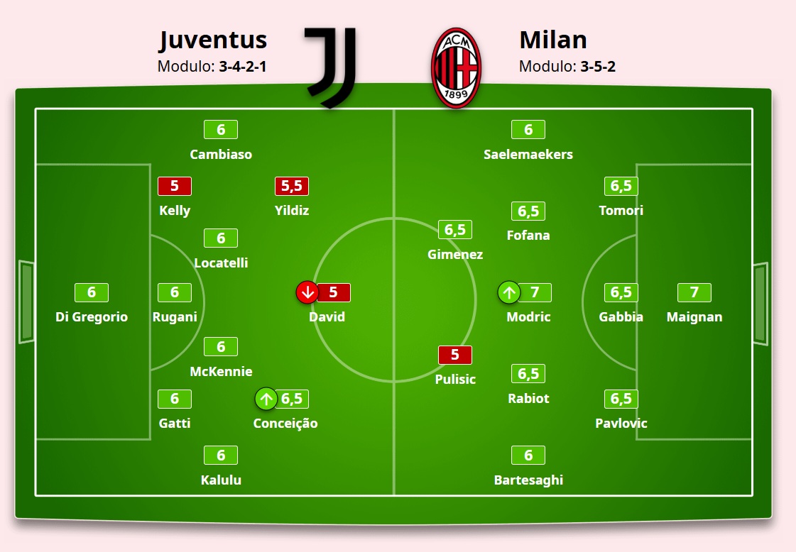 Remis 0:0 na Allianz Stadium nie przyniósł bramek, ale ujawnił wiele – zarówno indywidualnych błysków, jak i rozczarowań. Według ocen La Gazzetta dello Sport najlepszym zawodnikiem Juventusu był Conceicao (6,5), który napędzał ataki po prawej stronie. W Milanie – bezsprzecznie Luka Modric (7), który raz po raz uruchamiał ofensywę Rossonerich i miał kluczowy udział przy wywalczeniu rzutu karnego.