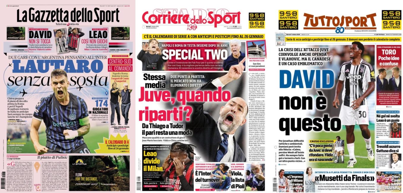 W górnej części pierwszej strony La Gazzetta dello Sport skupia się na sytuacji ofensywy Juventusu. Igor Tudor ponownie obdarzył zaufaniem Jonathana Davida, który staje się coraz ważniejszym elementem jego projektu. Gazeta podkreśla: „David nie do ruszenia: Tudor potwierdza pełne zaufanie do Kanadyjczyka”. Tymczasem Dusan Vlahović ponownie znajduje się na celowniku Bayernu Monachium, który rozważa jego transfer już w styczniowym oknie.