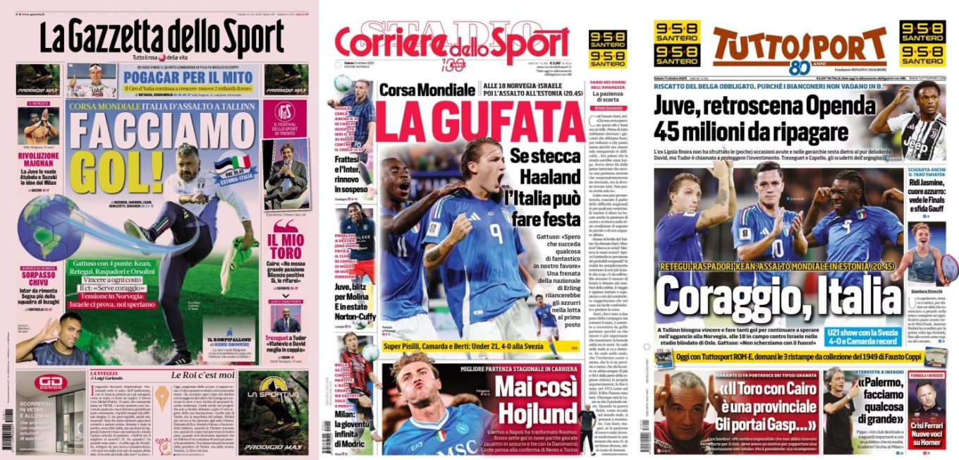 W dzisiejszym wydaniu La Gazzetta dello Sport szeroko opisano plan Gennaro Gattuso na mecz reprezentacji Włoch przeciwko Estonii w Tallinnie. Selekcjoner postawił na ultraofensywne ustawienie z czterema napastnikami. „Trzeba mieć odwagę” – powiedział Gattuso na konferencji przed spotkaniem.