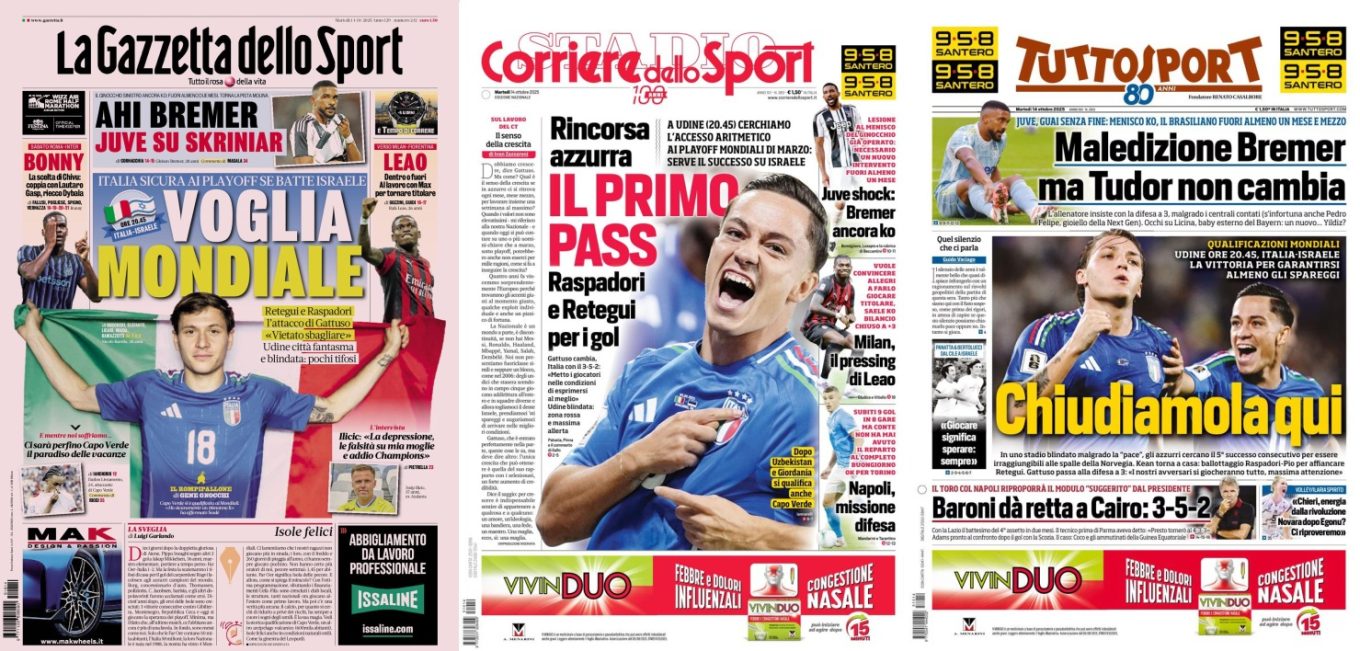 Dzisiejsze wydanie Tuttosport otwiera tytuł: „Zamknijmy to tutaj”, odnosząc się do kluczowego spotkania Włoch z Izraelem w eliminacjach Mistrzostw Świata. Mecz rozpocznie się o 20:45 na stadionie Friuli w Udine, który został objęty wzmożonymi środkami bezpieczeństwa. Azzurri celują w piąte z rzędu zwycięstwo, które zapewni im co najmniej udział w marcowych barażach.