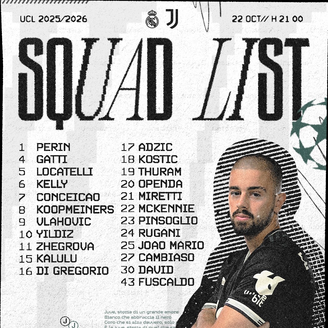 Igor Tudor ogłosił kadrę na jutrzejszy mecz fazy ligowej Ligi Mistrzów z Realem Madryt. Na liście powołanych brakuje kontuzjowanych Milika, Cabala, Bremera oraz Pedro Felipe. Edon Zhegrova po drobnych problemach z pachwiną jest już gotowy do gry, tak samo jak Fabio Miretti, który ma za sobą dłuższą absencję.