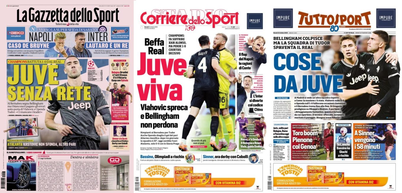 Juventus przegrał na Santiago Bernabeu z Realem Madryt 0:1 w meczu Ligi Mistrzów. Dzisiejsza La Gazzetta dello Sport otwiera wydanie tytułem: „Juve bez siły rażenia – przegrana 0:1 z Realem”. Jedyną bramkę spotkania zdobył Jude Bellingham, a Stara Dama zapłaciła za brak skuteczności pod bramką rywali – Vlahović i Openda nie wykorzystali kilku dobrych okazji. Po meczu trener Igor Tudor przyznał gorzko: „Brakuje nam liderów”. Nie lepiej poszło Atalancie, która nie potrafiła pokonać Slavii Praga na własnym stadionie – mecz zakończył się wynikiem 0:0, mimo wielu prób Krstovicia. Jak podkreśla dziennik, „Slavia uratowała się w Bergamo”.