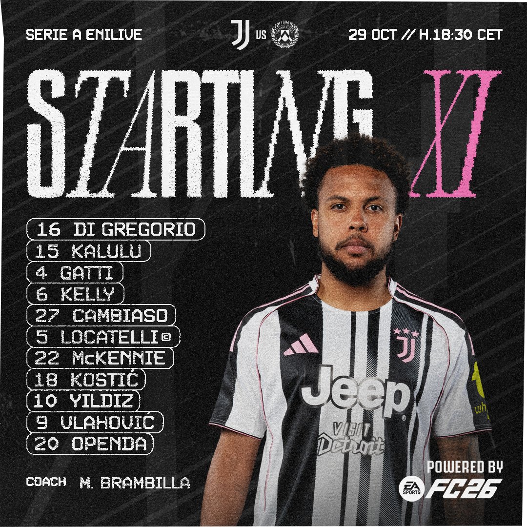 Wiemy już jak Massimo Brambilla zestawił skład Juventusu na dzisiejszy mecz z Udinese. Tymczasowy trener postawił na formację 3-4-1-2. W bramce bez zaskoczenia Di Gregorio, linię obrony zbudują Kalulu, Gatti i Kelly. W środku pola Locatelli i McKennie wspierani przez grających na wahadłach Cambiaso i Kosticia. Z przodu tuż za duetem Openda-Vlahović ustawiony został Yildiz.