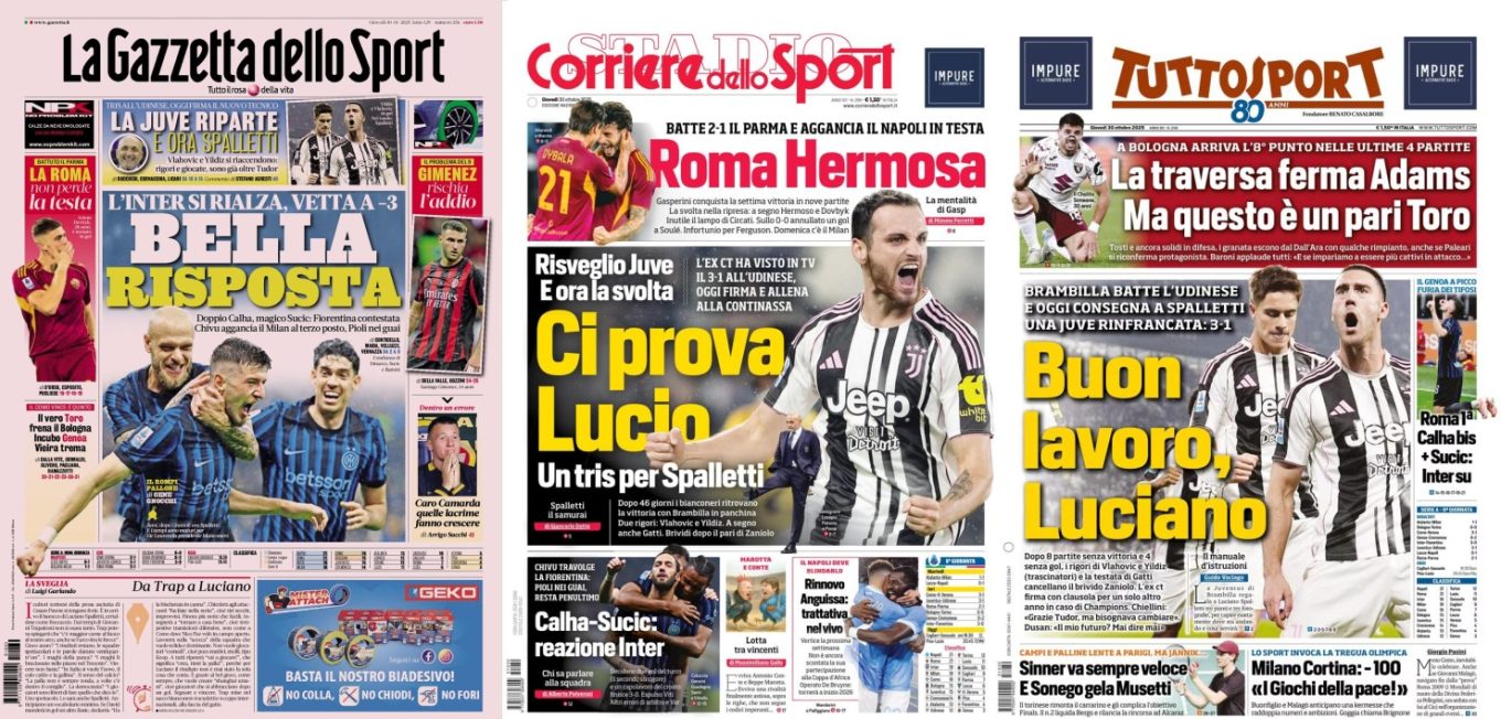 W górnej części okładki La Gazzetta dello Sport zapowiada nowy rozdział w Turynie: „La Juve riparte. E ora Spalletti”. Po zwycięstwie 3:1 nad Udinese Juventus z optymizmem patrzy w przyszłość, czekając na oficjalne potwierdzenie objęcia zespołu przez Luciano Spallettiego. Na boisku błysnęli Dusan Vlahović i Kenan Yildiz – bramki, rzuty karne i efektowne akcje przywróciły radość kibicom i pozwoliły choć na chwilę zapomnieć o trudnym okresie pod wodzą Tudora.