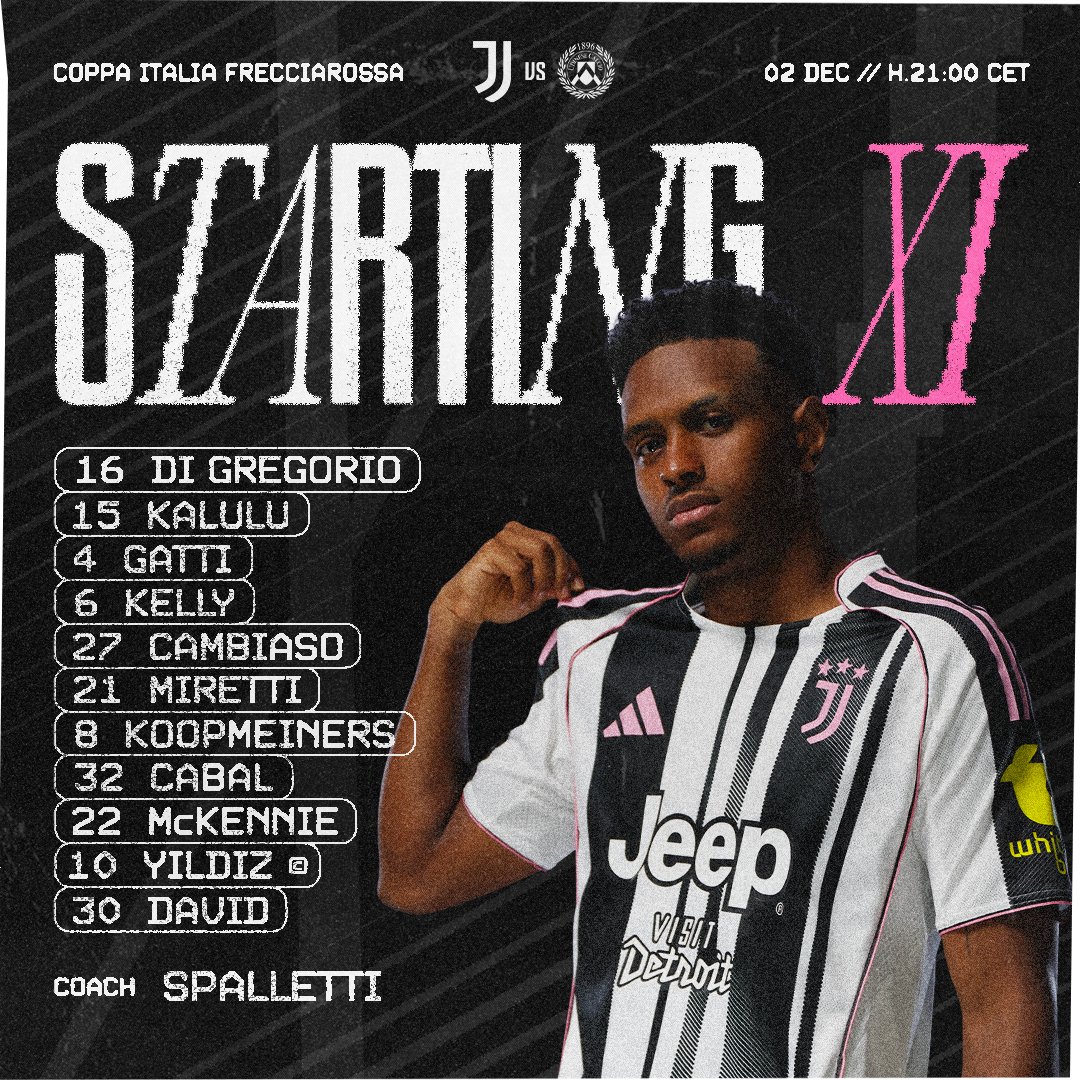 Poznaliśmy już skład, w jakim Juventus wyjdzie na Allianz Stadium w meczu 1/8 Pucharu Włoch przeciwko Udinese. W bramce stanie Di Gregorio, przed nim w trzy osobowym bloku obronnym umieszczeni zostali Kalulu, Gatti i Kelly. W środku pola Miretti i Koopmeiners wspierani przez wahadłowych Cambiaso i Cabala. Z przodu za najbardziej wysuniętym Davidem ustawiono Yildiza i McKenniego.