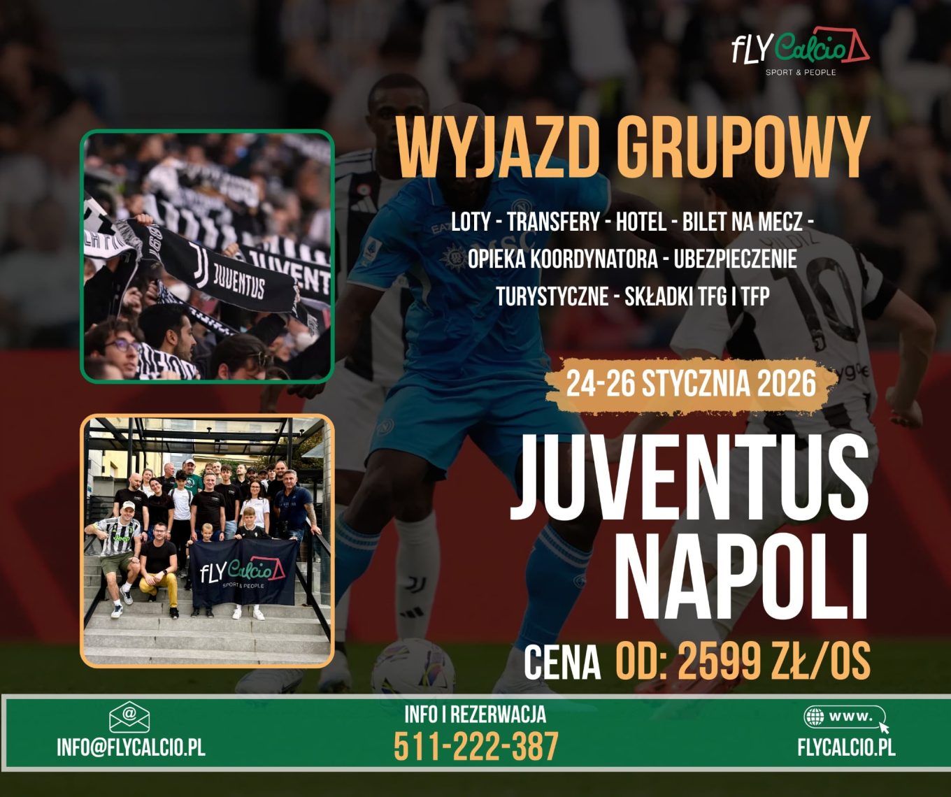Starcia Juventusu z Napoli to jedne z tych meczów, które zawsze ogląda się z ciarkami na plecach - bez względu na formę, bez względu na tabelę. To spotkania, które potrafią zmienić cały sezon. A że zapisy na wyjazd kończą się już 15 grudnia, to właśnie ostatni moment, żeby dołączyć do grupy, która w styczniu przeżyje to widowisko na żywo!