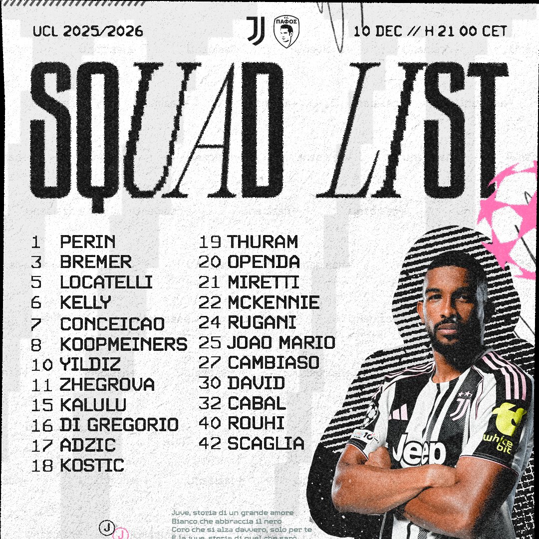 Luciano Spalletti ogłosił kadrę na dzisiejszy mecz z Pafos rozgrywany w ramach 6. kolejki fazy ligowej Ligi Mistrzów. Na liście wciąż nie ma kontuzjowanych Milika, Pinsoglio, Gattiego i Vlahovicia. Na szczęście uurazy wyleczyli już Bremer i Rugani, lecz nie wiadomo czy będą gotowi by zagrać od pierwszej minuty. Z drużyny młodzieżowej powołani zostali Simone Scaglia oraz Jonas Rouhi.
