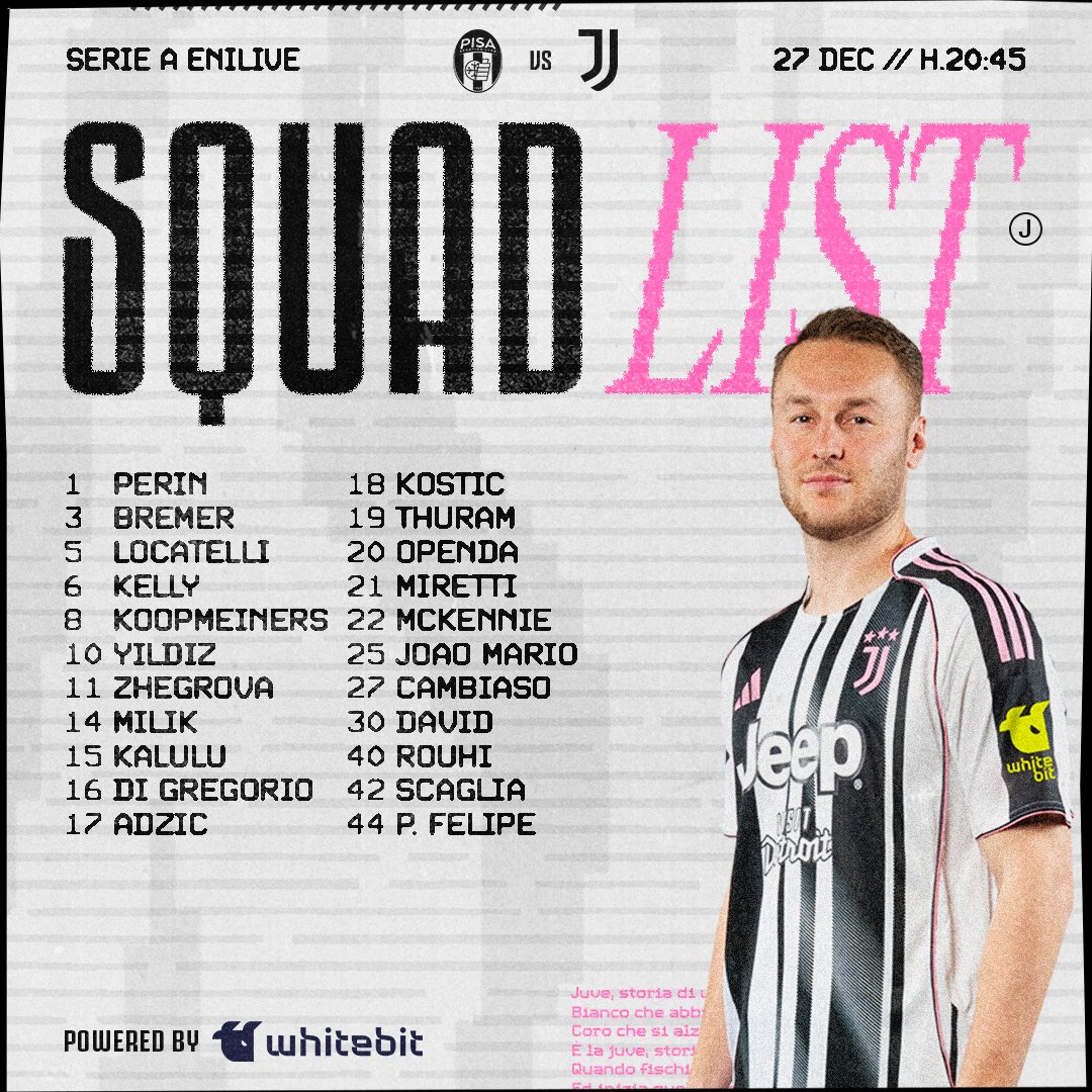Juventus ogłosił listę zawodników powołanych na mecz 17. kolejki Serie A, w którym piłkarze Starej Damy zmierzą się na wyjeździe z Pisą. Z kadry wypadło dwóch zawodników, ale gotowy do gry po przymusowej pauzie za kartki jest już Koopmeiners.