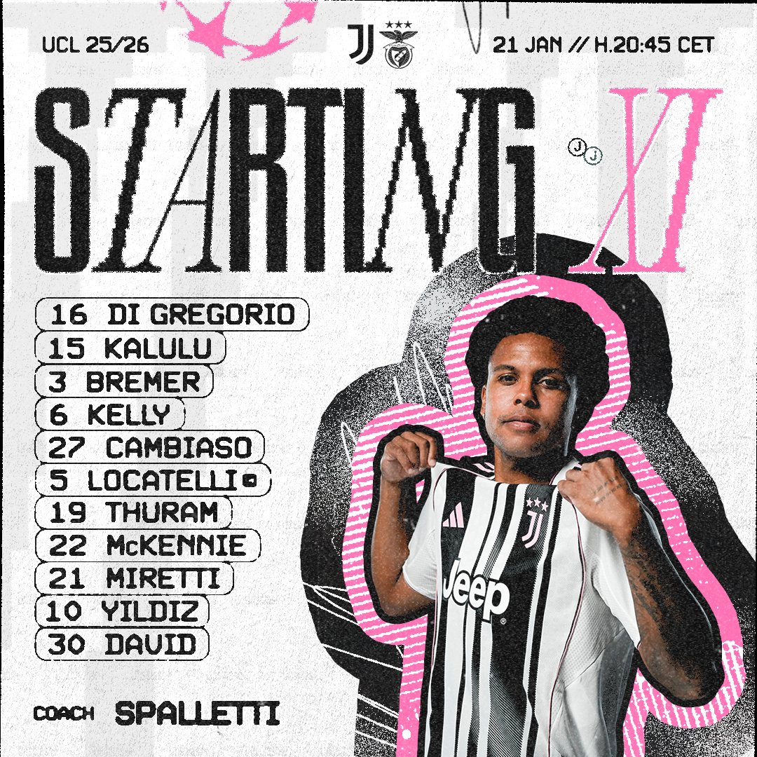 Luciano Spalletti ogłosił już wyjściowy skład na mecz 7. kolejki fazy ligowej Ligi Mistrzów z Benficą. W bramce stanie Di Gregorio, czteroosobową obronę zbudują Kalulu, Bremer, Kelly i Cambiaso. W środku pola zagrają Thuram i Locatelli, a w trójce za najbardziej wysuniętym Davidem ustawieni zostali McKennie, Miretti i Yildiz.